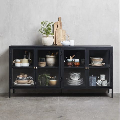 Rigtigt flot og moderne skænk. Lavet i sort metal, med sidder og fronter i glas, samt flotte stilrene messing greb.