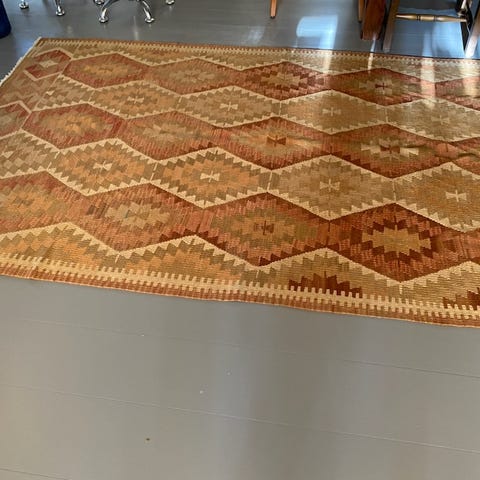 Ægte håndlavet tæppe i de smukkeste farvenuancer. Jf. årstallet broderet i tæppet er det fra 1947!