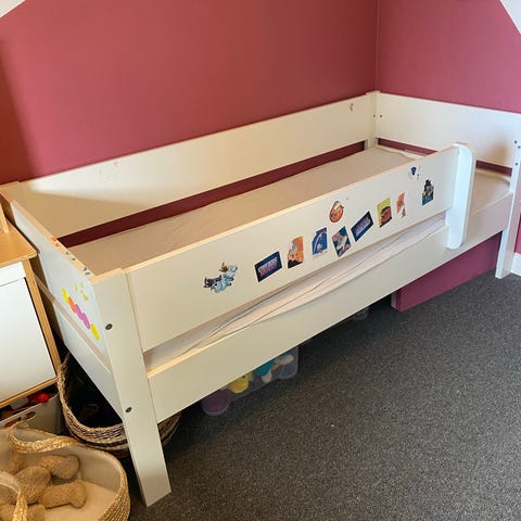 Halvhøj juniorseng sælges til hurtig afhentning, da vores datter er vokset fra den. Købt i Daels bolighus for 5 år siden. Forhæng og madras (pink med blomster) medfølger. Billeder kommer senere eller kan eftersendes.