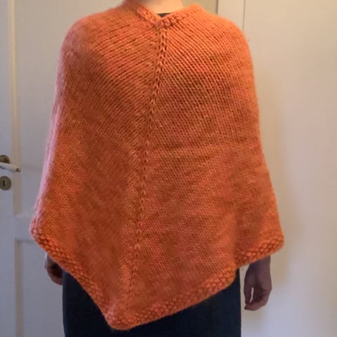 Lækker rød strik poncho m/hulmønster - købt hos Mamelukken i Skanderborg.