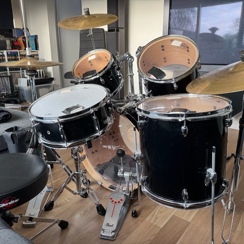 Pearl Export trommesæt i rigtig fin stand til salg pga. flytning til lejlighed. Materiale og størrelse er standard for Export Series. Velegnet til både øvede og begyndere.