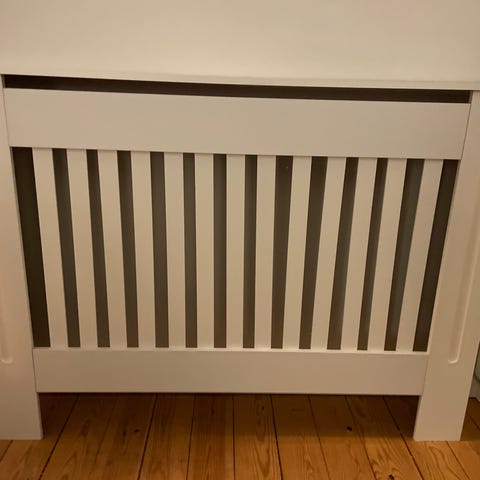 De første 6 billeder: De to radiatorskjulere der ikke fejler noget. Dog er toppen på radiatorskjuleren på billede 4 tilpasset to rør (se billede 5).