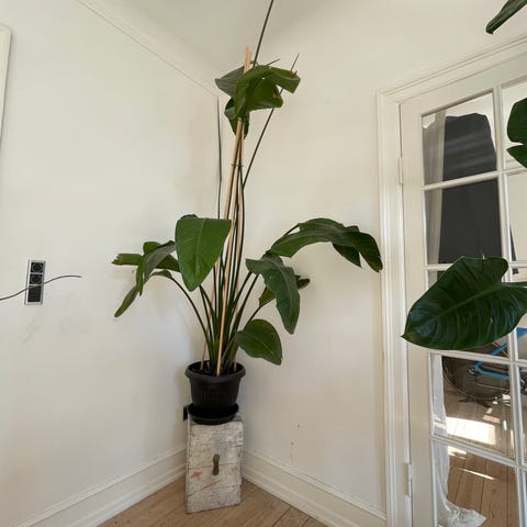En Strelitzia Nikolai-plante med en højde på cirka to meter. Den er købt for tre år siden, så den er vokset sig stor og flot. Dengang var den cirka 140 cm.