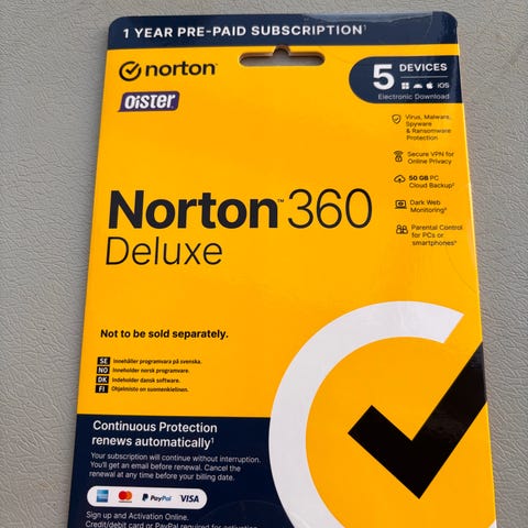 Jeg sælger en licenskode til: Norton 360 Deluxe - 25GB 1 User 3 Devices 12 Month, da det er noget jeg har fået med i køb af en ny computer, men ikke kommer til at bruge.