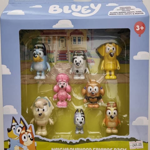 Bluey figursæt bestående af 6 stk. figurer i forskellige farver. Figurerne forestiller karakterer fra Bluey serien og er lavet i plastmateriale.
