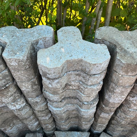 Beton fliser i krydsformet design, velegnet til udendørs områder som gangstier, terrasser og indkørsler. Fliserne er stabile og holdbare, og de leveres i store mængder på paller.