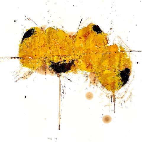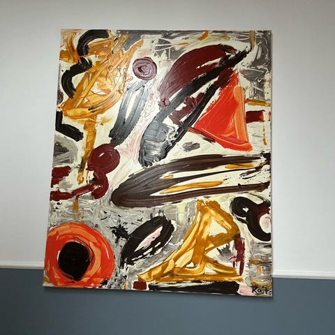 Jens Rost, Down to Earth maleri fra 2003. Maleriet har abstrakte former og farver, herunder blå, rød, hvid og gul. Det er udført på lærred og indrammet med træ.