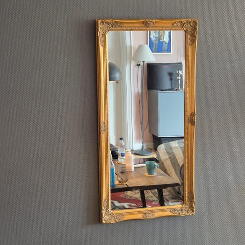 Spejl med dekorativ guldramme. Passer til ophængning på væg og kan bruges som fuldfigurspejl i boligindretning. 72 x 135 og 72 x 165 400 kr og 500 kr