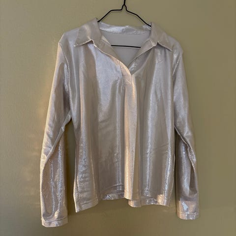 Skjorte i sølvfarve grå til kvinder i størrelse M. Materiale er ikke specificeret. Skjorten har lange ærmer og en løs pasform. Retro
