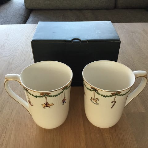 Royal Copenhagen Jule krus i porcelæn. Sættet indeholder to krus med dekorative julefigurer og grønne guirlander. Krusene er hvide med detaljer i farver. Velegnet til servering i juletiden.