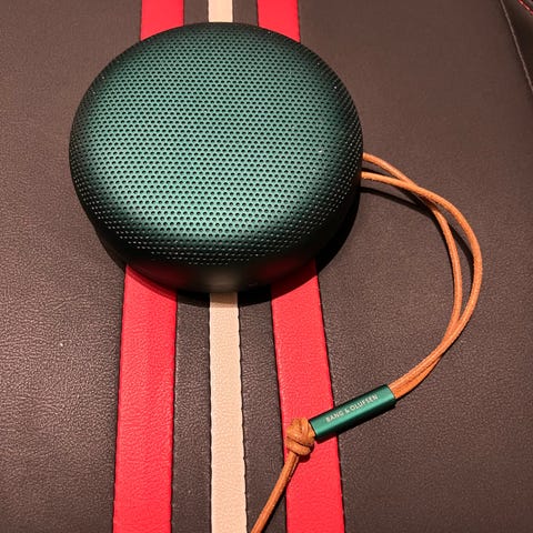 Bang & Olufsen bærbar højttaler i grå farve med bærehåndtag. Designet til nem transport og brug i forskellige miljøer.