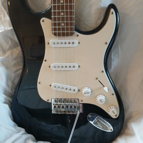Elektrisk guitar i sort farve. Modellen har et klassisk design med tre enkeltspolede pickups, tremolo-bro.
