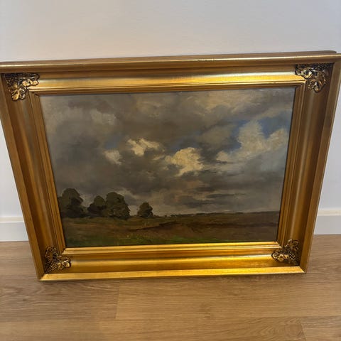 Carlo Hornung-Jensen Maleri af landskab med træer, mark og himmel, indrammet i en brun/guld ramme. Olie på lærred, detaljeret naturmotiver. Billedet hedder Mosen og er 1946.
