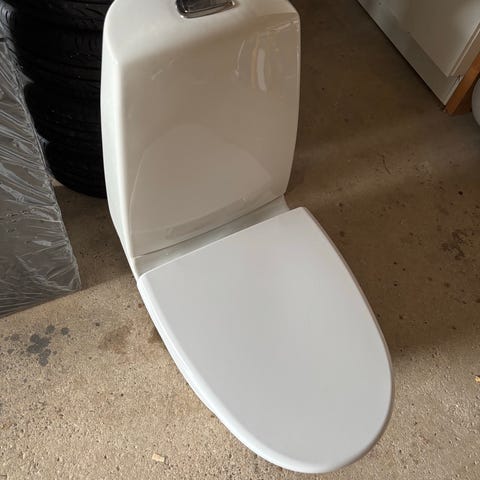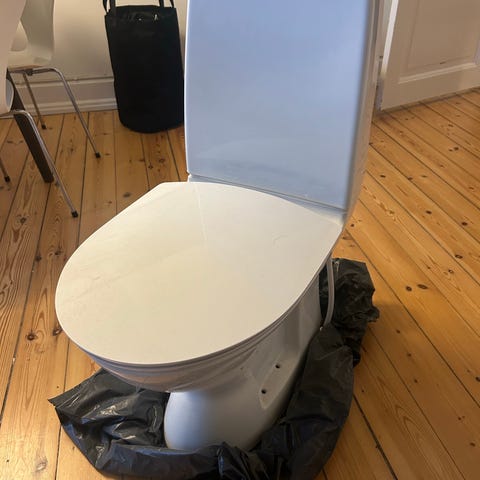 Toilet med tilhørende cisterne og skyllemekanisme i hvid porcelæn.