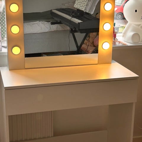 Med brugsspor men skrivebord fungere helt optimalt stol er dog vaklende kan mulighvis fixes hvis man er handy - men har aldrig været helt stabil ....Skyspejl og hylde kan medfølge hvis ønskes