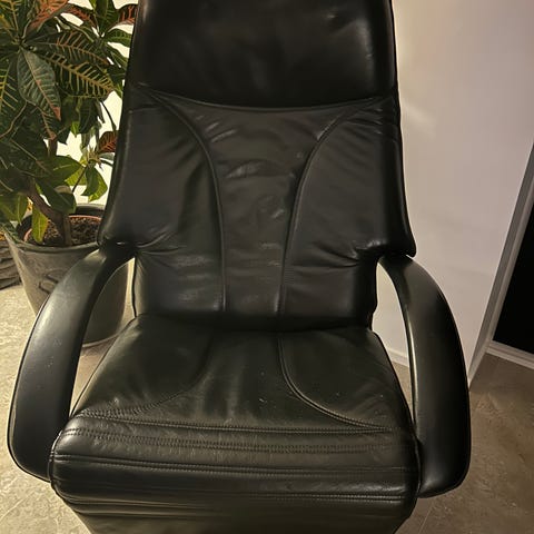 Lav stol med vippefunktionen i sort læder med armlæn. Stolen har en polstret sæde- og ryg del