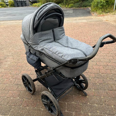 Komplet Odder barnevogn i lysegrå stof. Brugt men i rigtig god stand.Kommer med lift, gode madrasser, flere lagner, sele, regnslag, myggenet, flaskeholder med termo, tekstilrens og læderfedt.