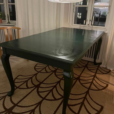 Utrolig solidt bord i egetræ med sæbebehandlet bordplade og to ekstra plader på hver 45 cm. Benene kan tages af under transport. Skal bæres ned fra 1. sal. Sælges fordi vi har fået et andet bord.