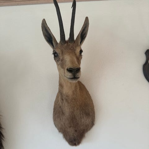 Opsats af gemse hoved med naturlige horn og pels. Anvendes som vægdekoration. Farverne inkluderer brun og beige nuancer.