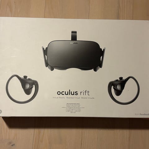 Oculus Rift virtual reality headset med tilhørende kabler og controllere. Headsettet har justerbar rem og polstring for komfort. Leveres med sensorer og tilkoblingskabler til PC. Designet til brug i VR-applikationer og spil.