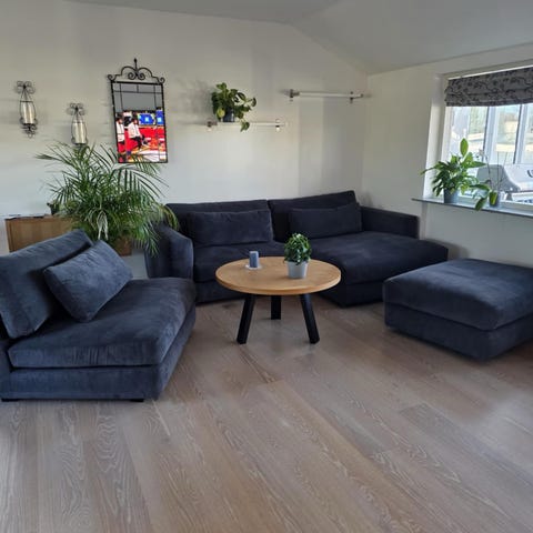 Lækkert sofa hjørne- og pufmodul fra Ilva, model Birmingham, Verdon Ocean stof (mørkeblå/petroleumsfarvet), som er slidstærkt, brugt 2-3 gange og vi sælger da det bare står og fylder op, perfekt til ungdomsværelse, repos, entre og lignende steder hvor der måske ikke er så meget plads, købt i april 2024 for 10.000 kr (kvittering haves), sælges for 6.000 kr