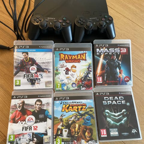 Sony Playstation 3 spillekonsol med to controllere og spil