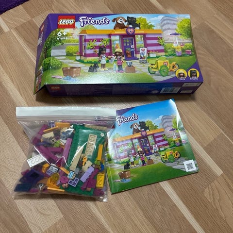 LEGO Friends byggesæt med forskellige temaer og dele. Indeholder elementer i flere farver og materialer, designet til kreativ leg og konstruktion.