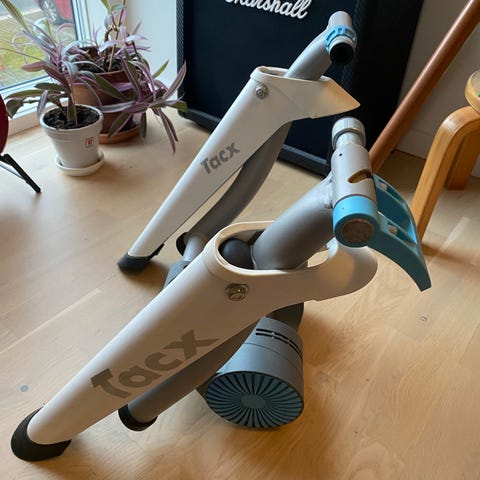 Tacx rulletræner til cykel med blå ruller og sort ramme. Bruges til indendørs cykeltræning.
