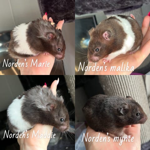 Nu er det muligt at købe jeres nye bedste ven! Uffe &uno og ulrikke er født d 8/11 og er klar til at flytte d 12/12 hvor de er 5 uger gamle. De var et lille kuld på 3 og de er derfor allerade nu nogen store basser. De opvokser i rolige omgivelser i vores opdræt hvor de dagligt håndteres og bliver socialiseret, man sikre sig derfor en 100% håndtam hamster som blot skal vænne sig til det nye hjem når den flytter hjemmefra!