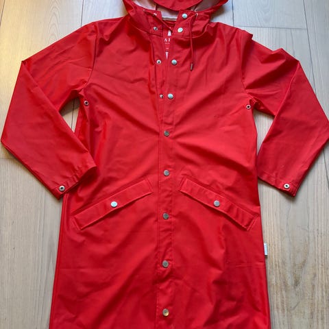 Regnfrakke eller regnjakke i en mørk rød farve. Str. hedder M/L