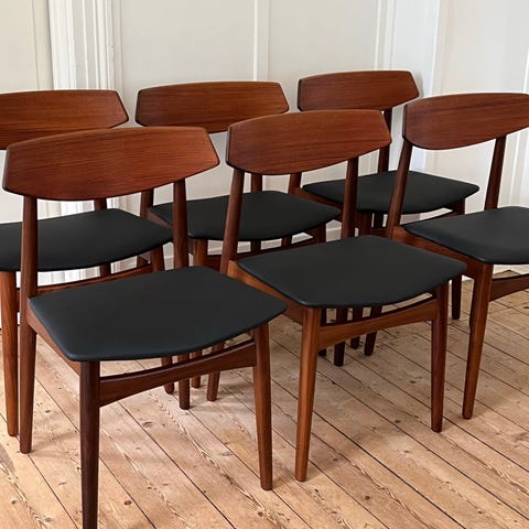 6 ens stole i teak fra 1960'erne. Betrukket med kunstlæder, som trænger til udskiftning, derfor den gode pris. 200kr/stk. Skal afhentes i Vejle.