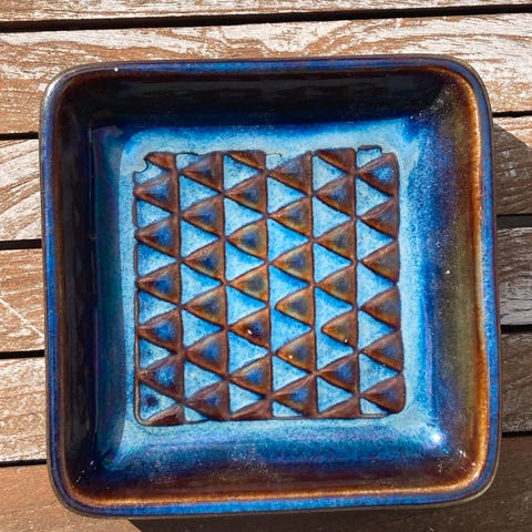 Blå skåle. Nr 3335 18 x 18 cm. Nr 3338 18,5 x 9,5 cm. Pris for begge.