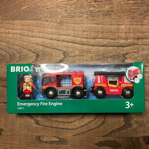 BRIO brandbil (33811) med 2 slangevogne. Brandbilen har en knap, der tænder sirene og blå blink.