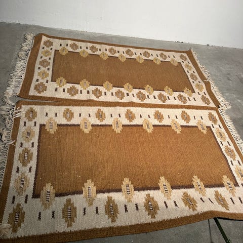 Meget fint klassisk Rölakan gulvtæppe ,- svensk moderne kelim - i tyk uld sælges for 1275 kr. Oversiden er helt ren og uden pletter men bagsiden har nogle små skønhedspletter. Da den side vender nedaf, kan jeg ikke se det som et problem, men prisen er nedsat i forhold til det. Tæppet har ingen slid og er i farverne hvidgrå, lyseblå, mellemblå og mørkeblå med indslag af orange farve. Det måler ca 142 x 220 cm inkl de flettede frynser.