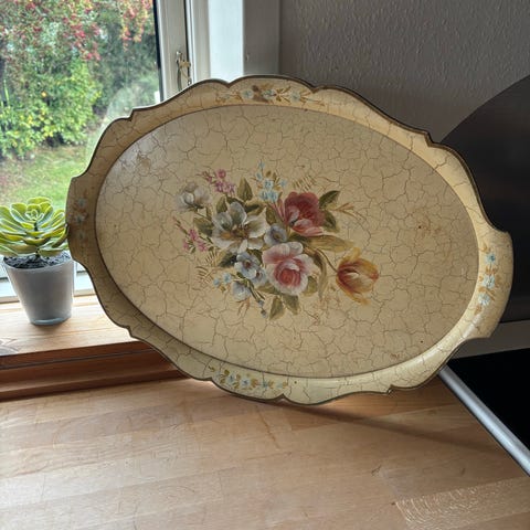 Wiggers blomstrede serveringsbakke er en vintage håndmalet træbakke fra Danmark. Den er typisk fremstillet i midten af det 20. århundrede, ofte mellem 1940'erne og 1960'erne.