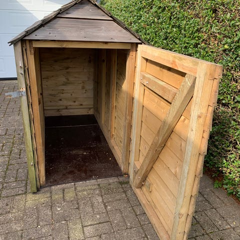Opbevaringsskur i træ med enkel dør og vinduesåbning, indvendigt beklædt med isolering og træpaneler. Skuret er velegnet til opbevaring af haveredskaber eller lignende. Skuret står på hjul men kan ikke køres væk og er i brugbar stand med synlige tegn på vejr og alder. Indbygget skabe.