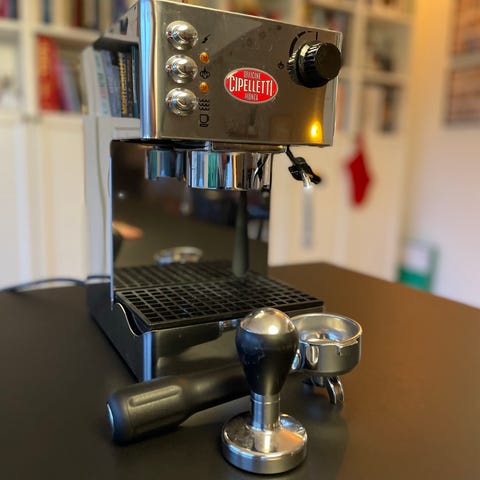 Har grubbehoved til 1 og 2 kopper. Kværn, knockbox mælkekande og tamper medfølger.