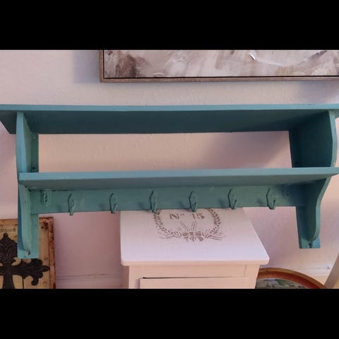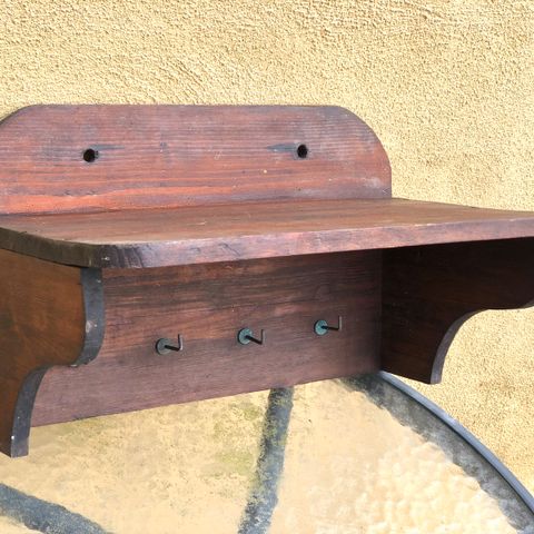 Sødeste hatte hylde med knager og bar. Fantastik til entréen, børneværelset, sommerhuset mm. Hvad jeg kan se er det massiv fyrretræ.