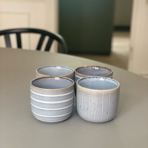 3 H&M Home stentøjs krus i lysegrå farve. Krusene har et enkelt design med hank og en glat overflade. Fremstillet i stentøj og egnet til daglig brug.