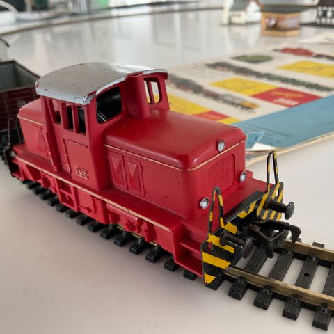 Et virkeligt gammel modeltog sæt til salg. Lokomotivet hedder "Niels" og er lavet af jern og messing med håndmalede detaljer. Der er plads til en lyspære i fronten, og en kontakt på bagsiden. Det ligner noget fra starten af 1900-tallet.