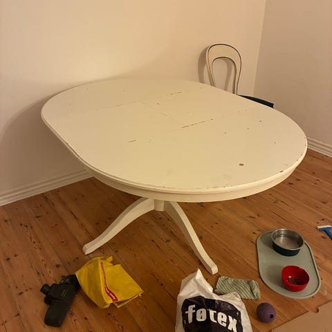 Rund spisebord gives væk. Ok stand. Metal fod. Kan hentes i kastrup.