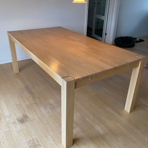 Super flot massivt egetræbord der kan slibes og olieres efter ønske. Der medfølger to udtræksplader.
