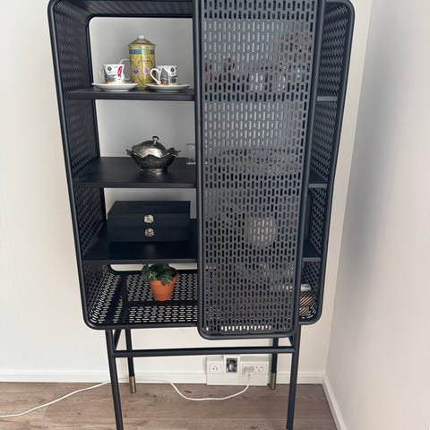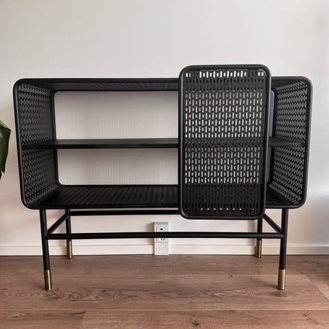 Stilren skænk fra Muubs. Sort stål med messing detaljer. Lågen kan skubbes alt efter retning man ønsker. Fejler intet, står som ny.
