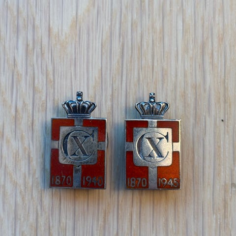 Dansk Sølv smykke vedhæng med rød emalje (kongemærke). Vedhænget har et rektangulært design og inkluderer detaljer i sølv. Velegnet som tilbehør til smykkesamlingen. Endvidere en gennemhullet “mønt” med Christian den 10.s initialer. Sælges samlet