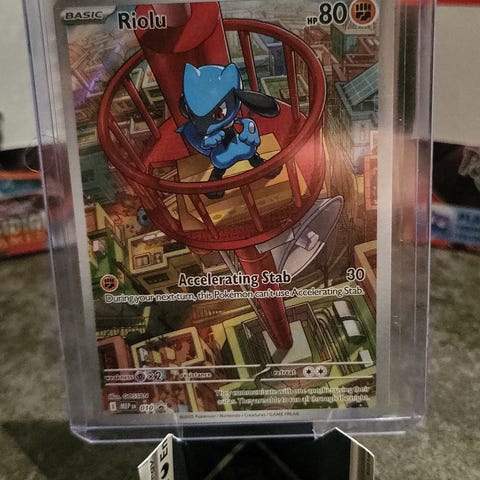 Pokémon Riolu samlekort med illustration af karakteren Riolu. Kortet viser angrebene Boxhieb og Waghalsiger Sturmangriff med tilhørende skadeværdier. Kortet har et farverigt design med blå og gule nuancer og er en del af Pokémon-kortspillet.