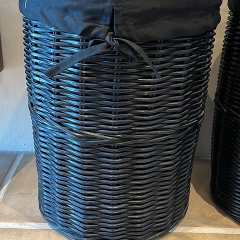 Vasketøjskurv i flettet naturmateriale med hvidt stofbetræk