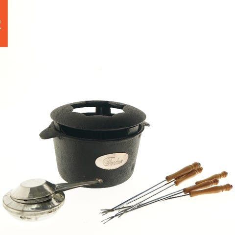Komplet Fondue Set i rustfrit stål med 6 fondue gafler, praktisk trådstativer og brænder. Indeholder gryde, gafler, bakke og brænder i rustfrit stål. Kapacitet ca 1.7 l.