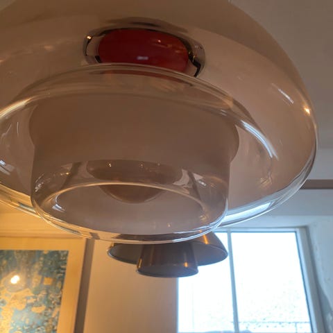 Vitra Verner Panton Pendel lampe med kugleformet klar skærm og indvendige metalplader. Lampen har en kombination af klar plast og metal i sølvfarve. Designet af Verner Panton, velegnet til ophæng i loft.