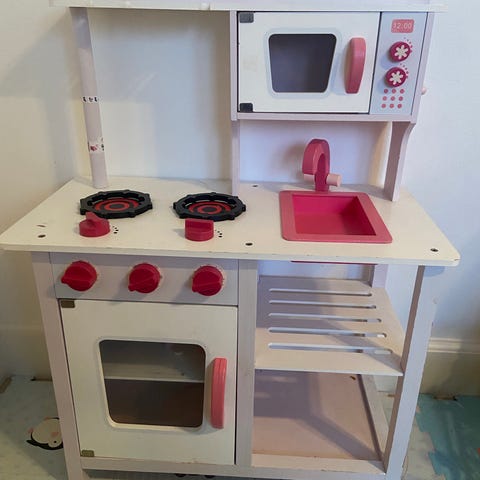 Legekøkken med en masse sjove lege og rigtige miniature legeting. Potter, pander, glas, flasker, mini-varer, kurv, hviskestykker, popkornbærer, kreditmaskine, og meget mere.