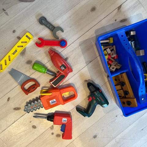 Kassen indeholder skruer, plader, pinde og møtrikker, som alle kan skrues sammen lige som man ønsker det.
